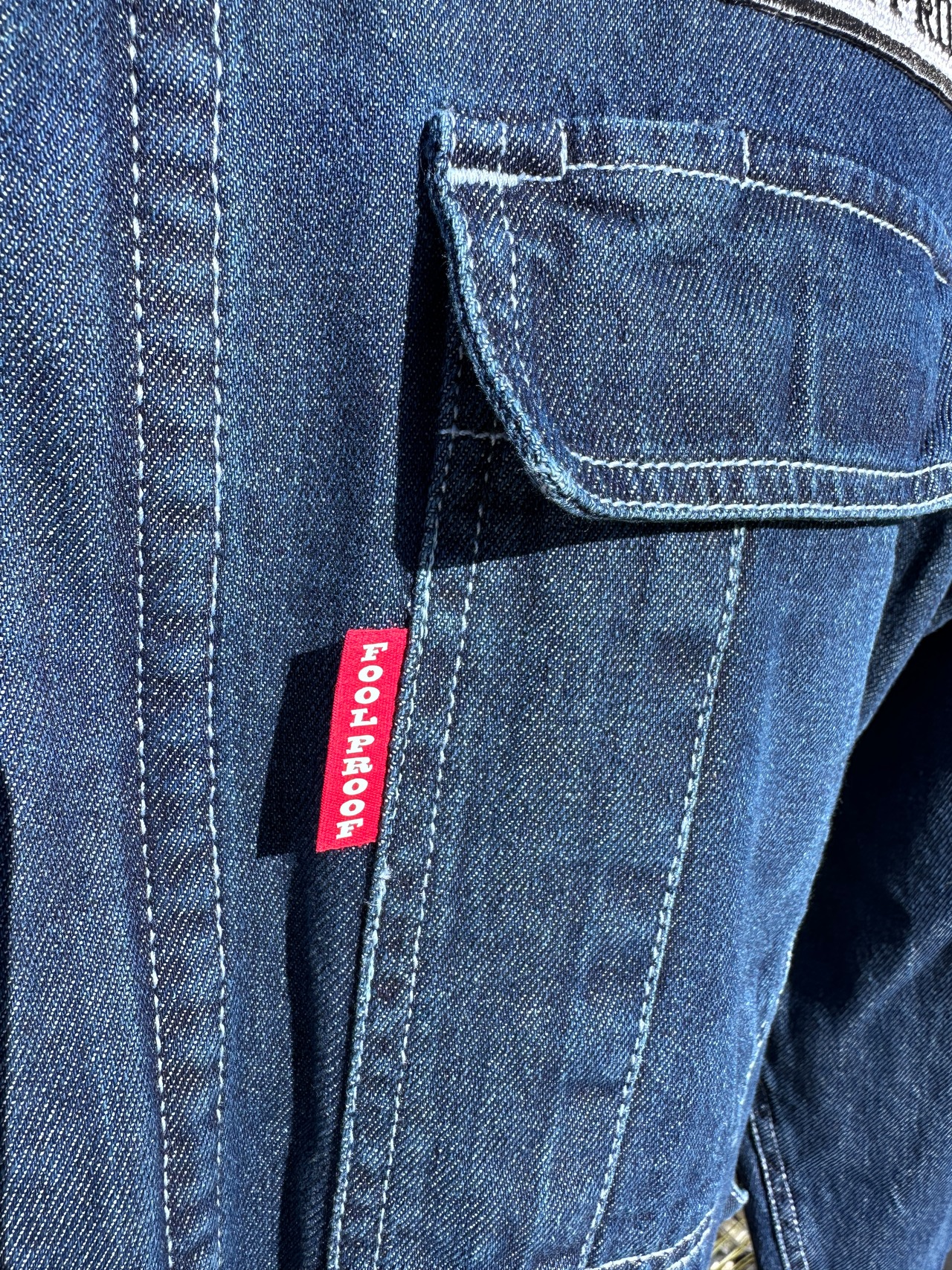 胸ポケットのオリジナル赤タグ【FOOLPROOF】がアクセントになっております。